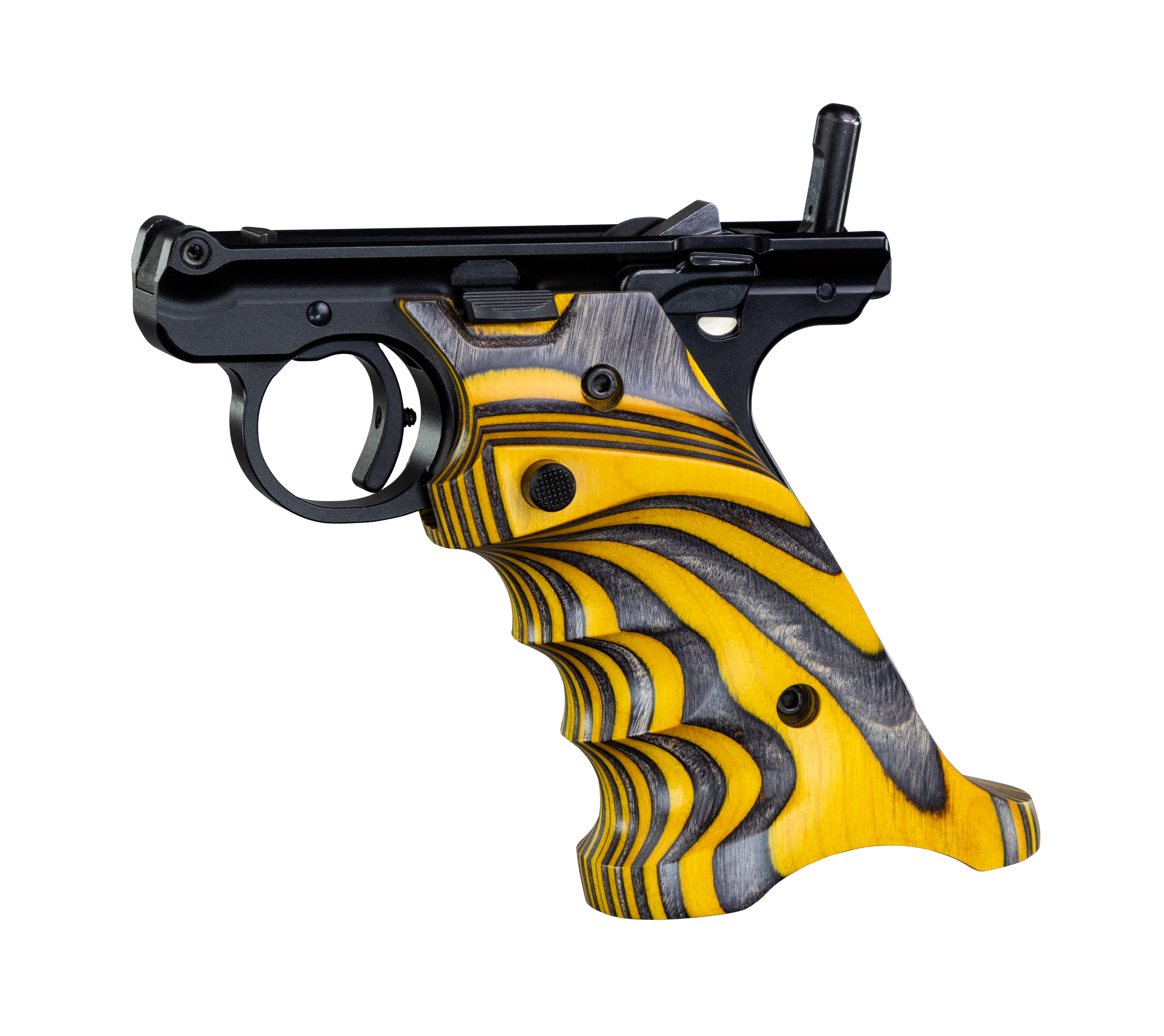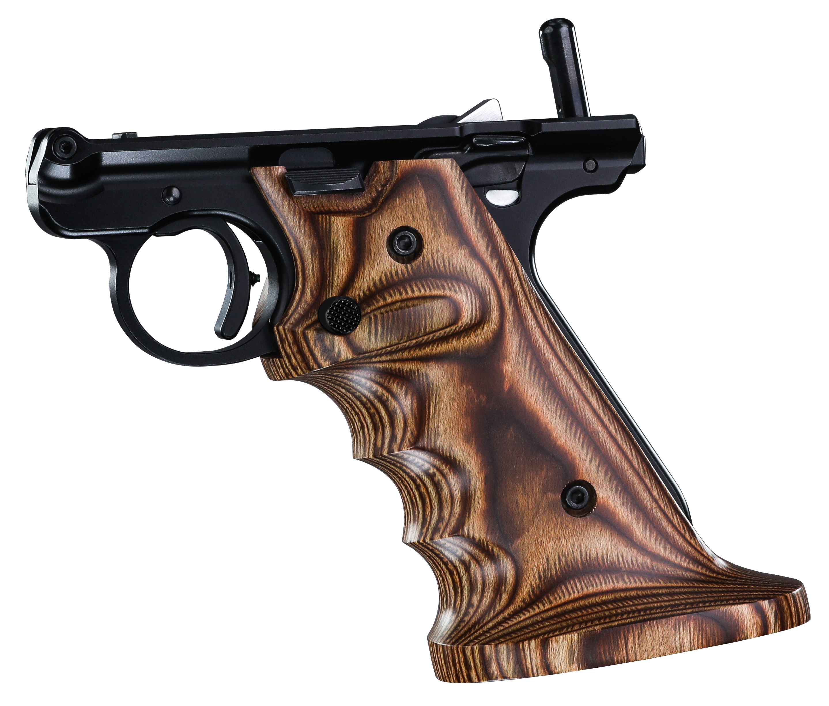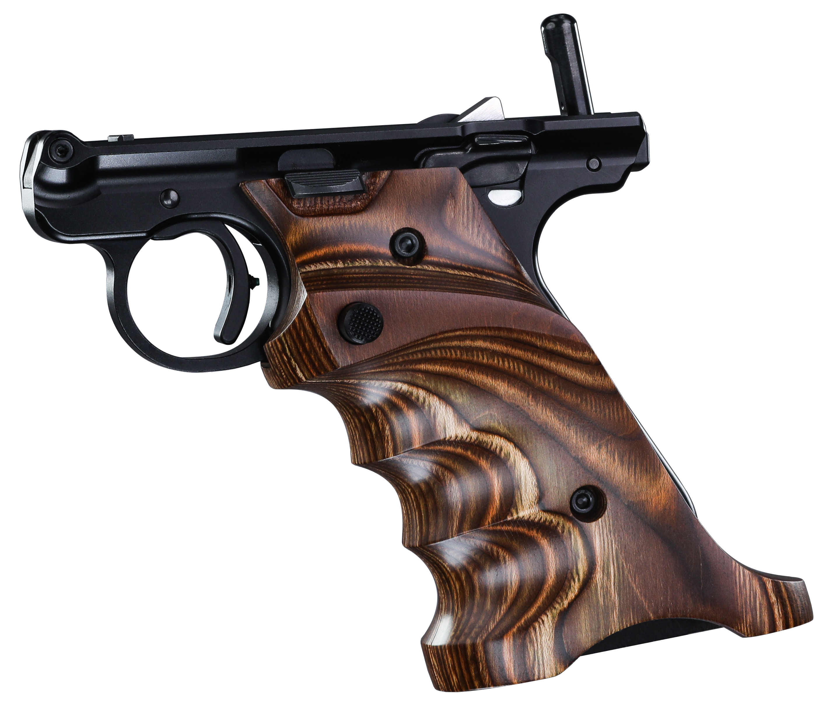 Target grips feature thumb rest, heel rest and finger grooves. Designed to give the shooter a relaxed, steadier hold. CNC-machined from laminated wood and available in a variety of colors. A magazine release extension is included.