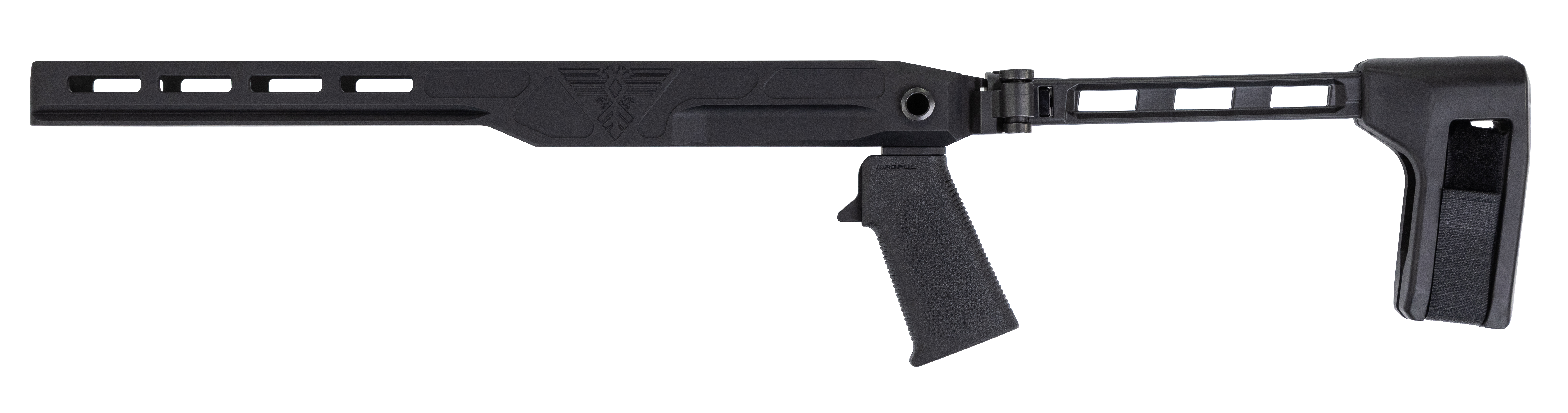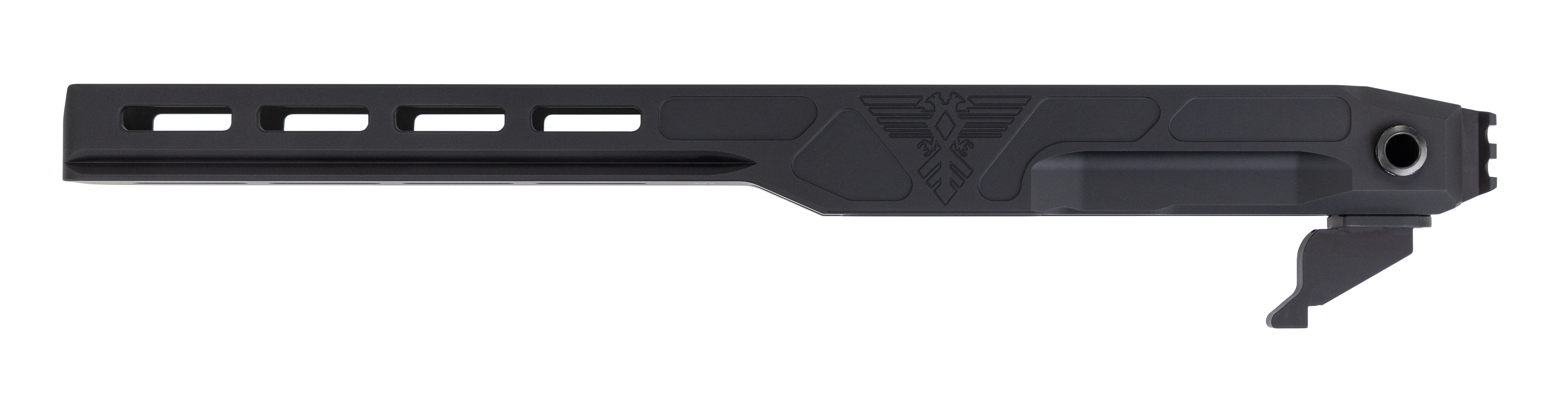 This chassis is Enoch's 4th iteration for the non-takedown models. It is the most robust platform available for tripod activities with your favorite plinker. They have added a 4th MLok slot, 1.75″ of overall length, and an integral Swiss ARCA rail to their Deep Six platform, to give you the best of all worlds.